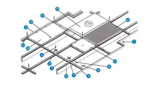 1)T形結(jié)構(gòu), 干式吊頂, 陽(yáng)極鋁材料, 表面電泳處理.
