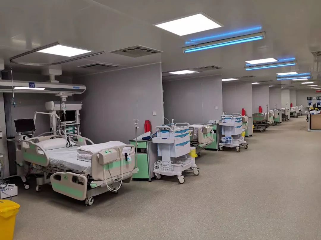 武漢火神山醫(yī)院為收治新冠肺炎確診患者而建,共設計了1000張床位的負壓病房,由多棟獨立病房樓組成,每間病房用一個集裝箱改造而成,設置1-2張病床,每間病房設置送風和排風系統(tǒng),保持負壓運行。ICU由鋼結構和彩鋼板搭建而成,分兩個區(qū)域,每個區(qū)域設置15張ICU病床,兩區(qū)共30床,凈化級別為十萬級,設置全新風、全排風系統(tǒng),新風通過粗、中、高效過濾,通過新排風口的合理設置和房間壓力梯度的控制,保證醫(yī)護人員的安全,排風通過粗、中和高效三級過濾后排到屋頂2米以上,以消除對周邊環(huán)境的影響。