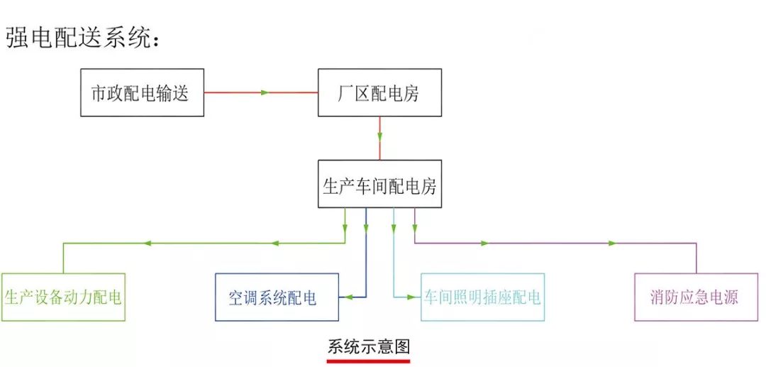 強(qiáng)電配送系統(tǒng)是指將市政供電網(wǎng)通過(guò)廠區(qū)變配電房,配電房將電力輸送到各個(gè)車間,并在此配送到各個(gè)需求點(diǎn)。主要包括生產(chǎn)動(dòng)力配電、空調(diào)系統(tǒng)配電、車間照明插座配電及消防應(yīng)急配電。通過(guò)強(qiáng)電網(wǎng)的敷設(shè),使各個(gè)車間的功能能夠逐步完成正常的生產(chǎn),不影響人們的工作生活。