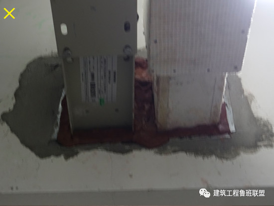 錯(cuò)誤:樓板處無(wú)專用彈簧減震支撐,穿越樓板防火封堵粗糙。